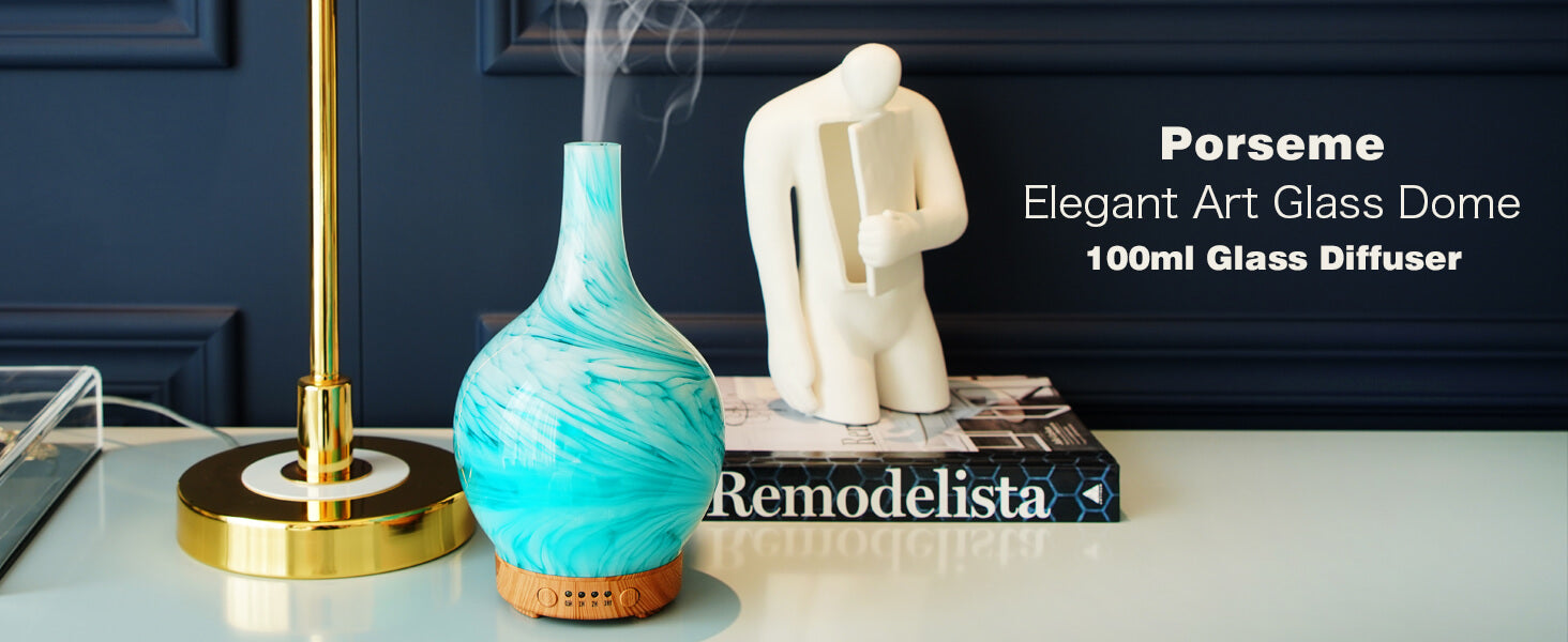 • HANDMADE GLASS DIFFUSER - Our Porseme 100ml aroma diffusers are 6'' in diameter and 9'' in height. They are handblown glass so each glass globe is unique. 100ml essential oil diffuser lasts for 4 hours and has a good output of mist. Fits a room not larger than 15*15(ft). You can place in any area and relax.
