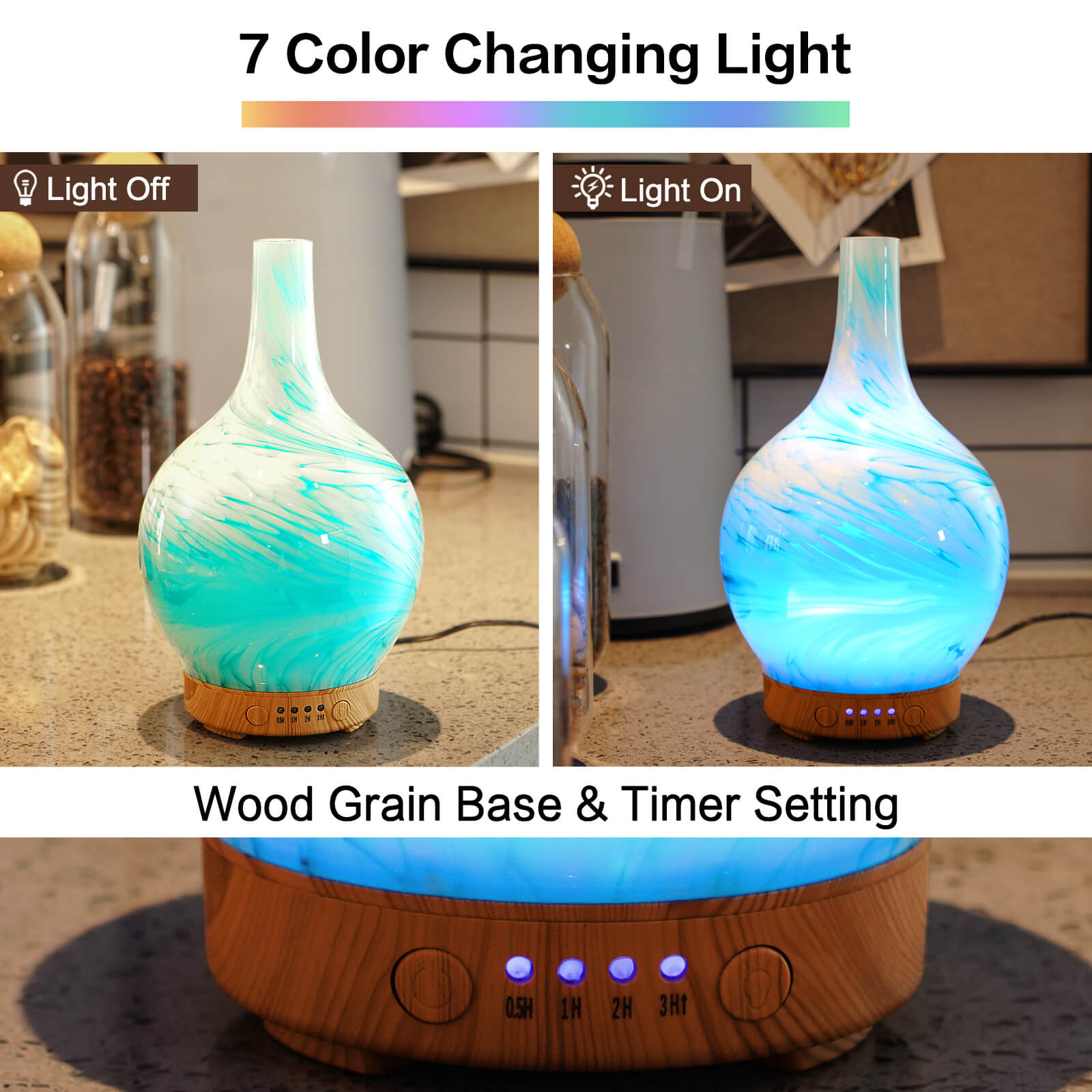 • UNIQUE ART DECORATIVE DESIGN - Our 100ml glass essential oil diffuser has an elegant starry pattern glass cover and wood grain decorative base. It is very suitable for your bedroom, living room, children's room, study room, office, and yoga room.