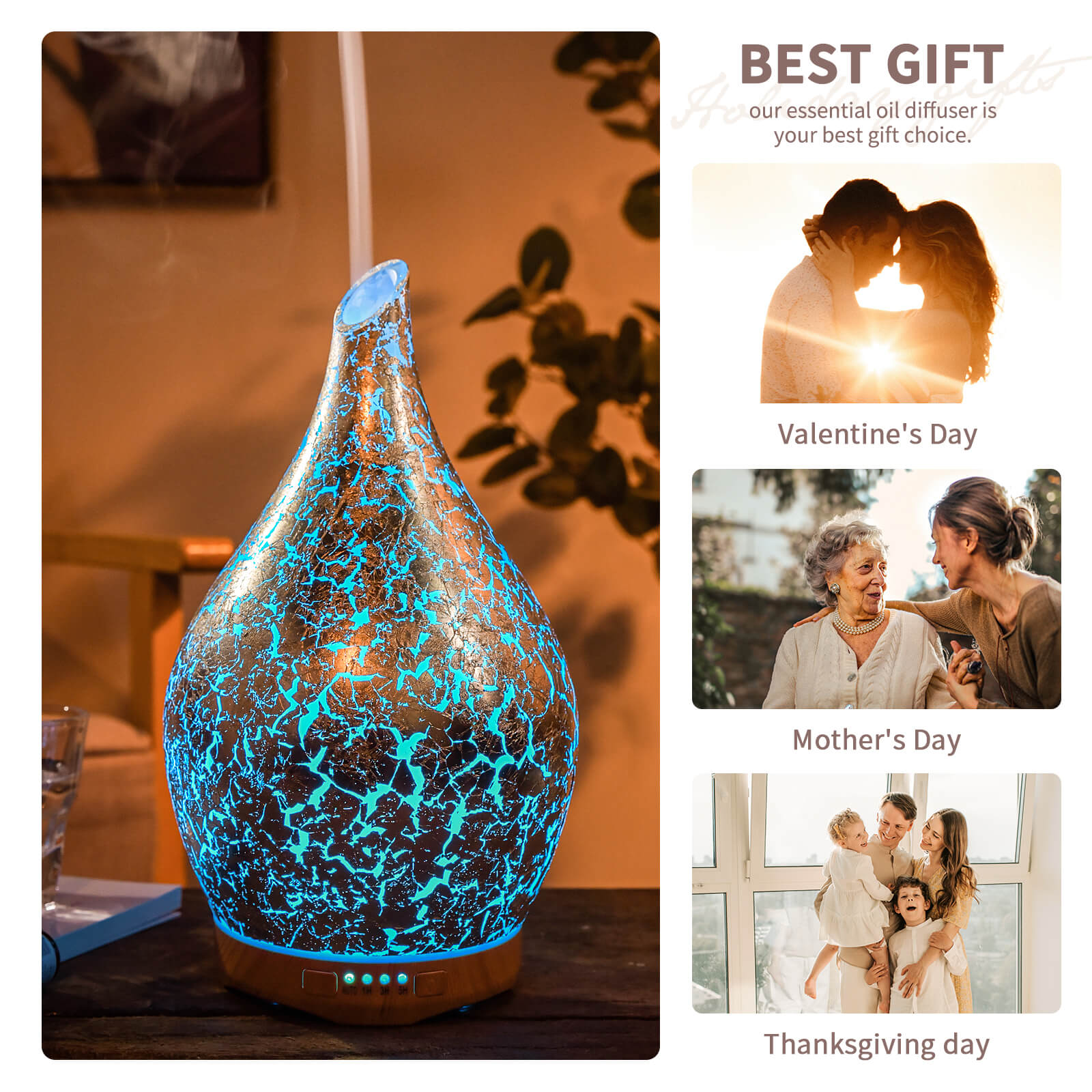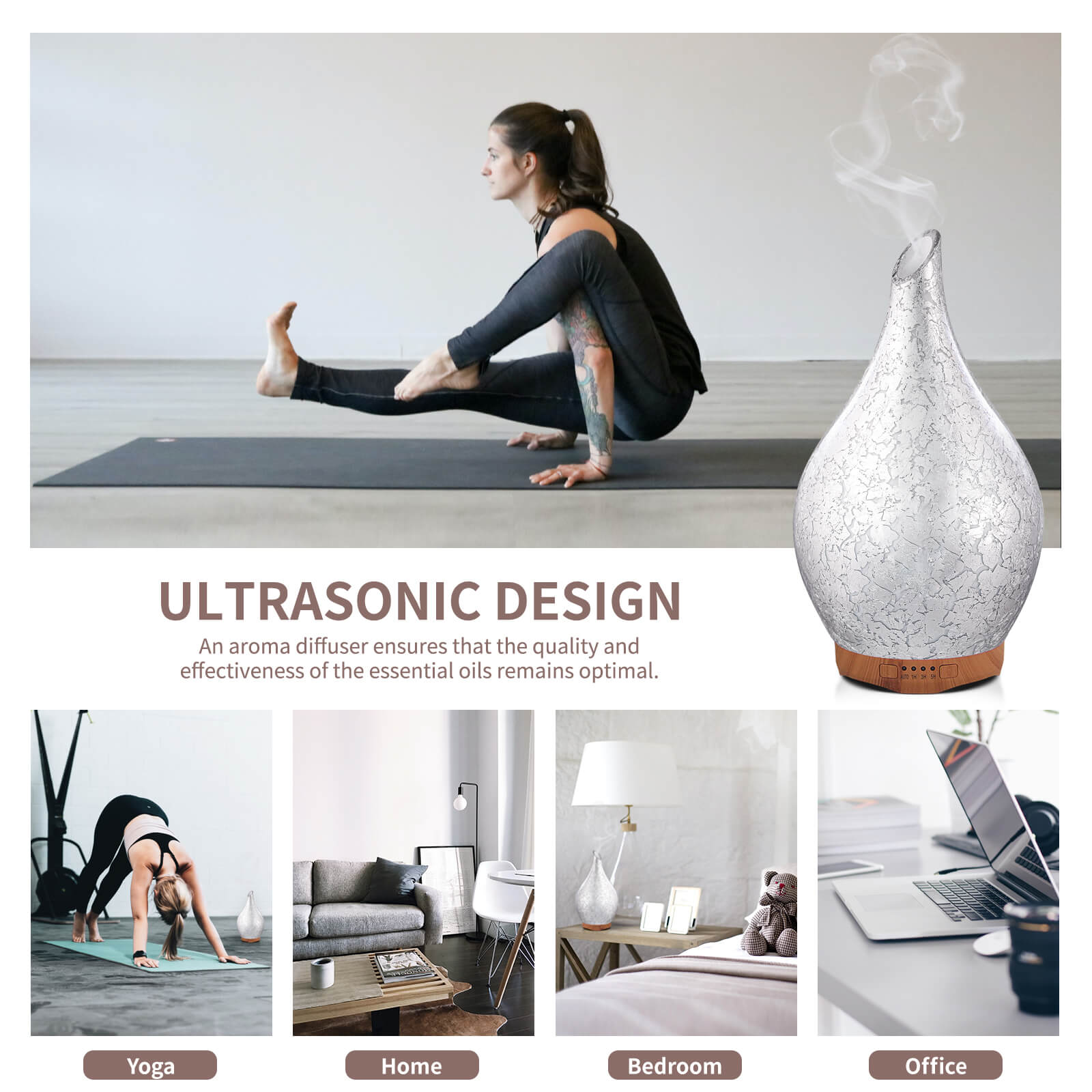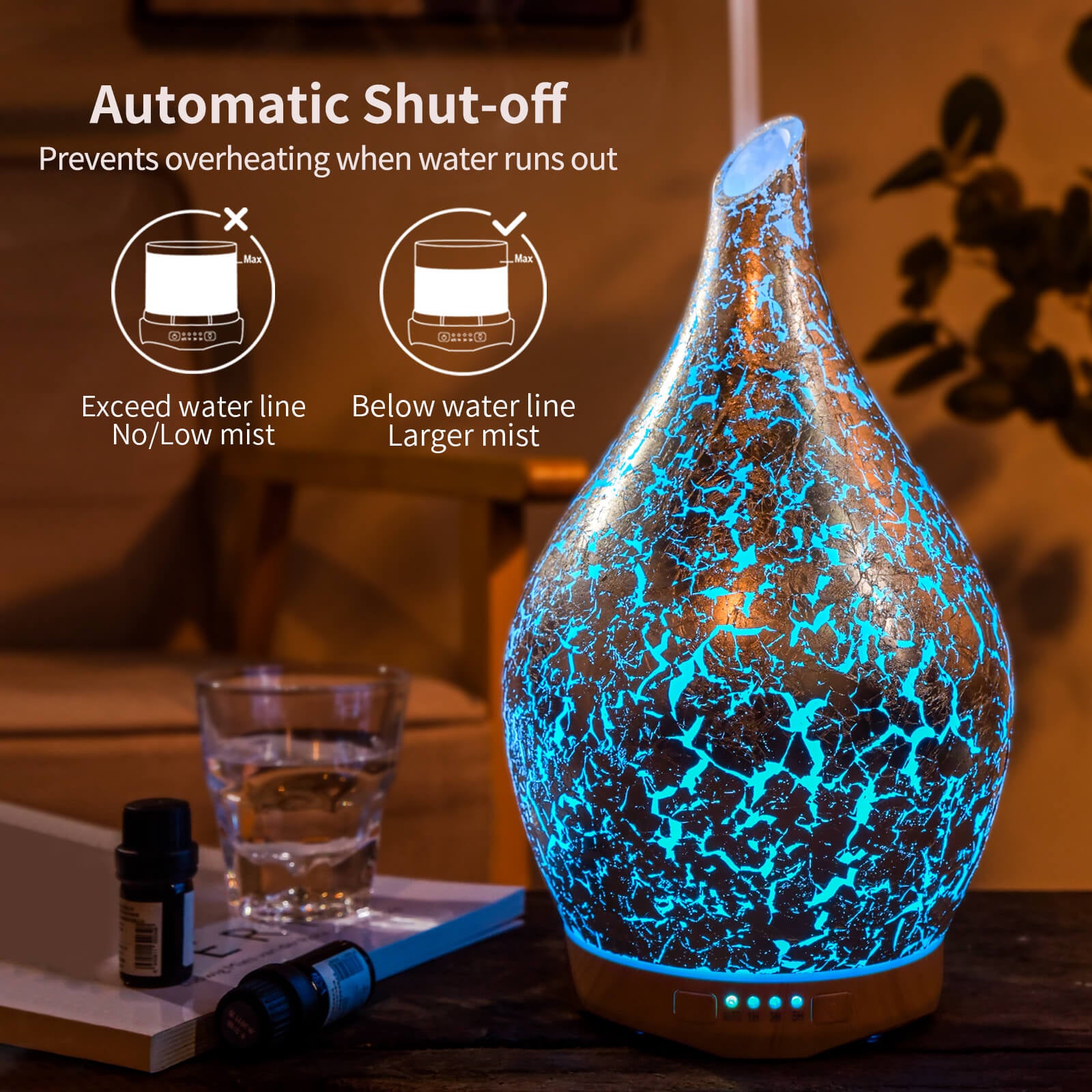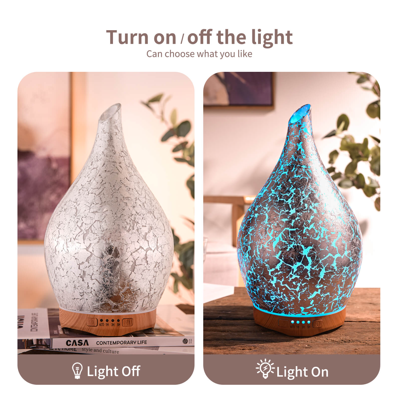 - 【Unique Decorative Aroma Diffuser】Our 280ml glass essential oil diffuser has an hand blown glass with a elegant sliver leaf feature and wood grain decorative base. It is very suitable for your bedroom, living room, children's room, study room, office and yoga room.