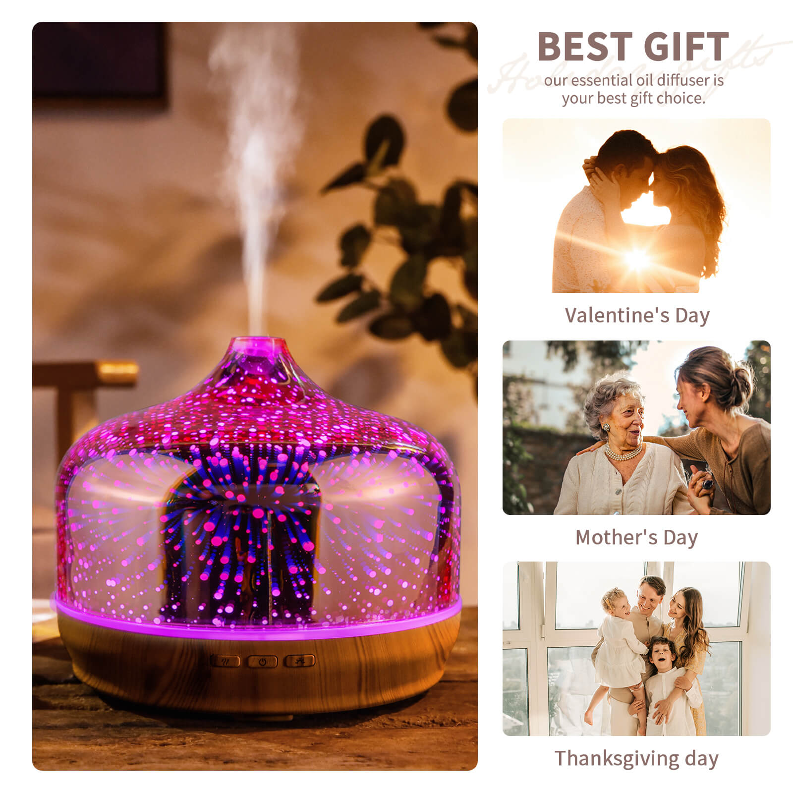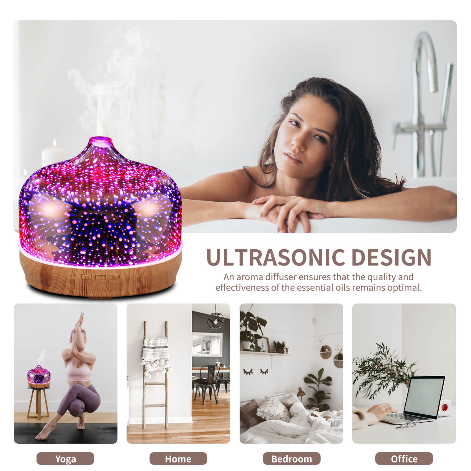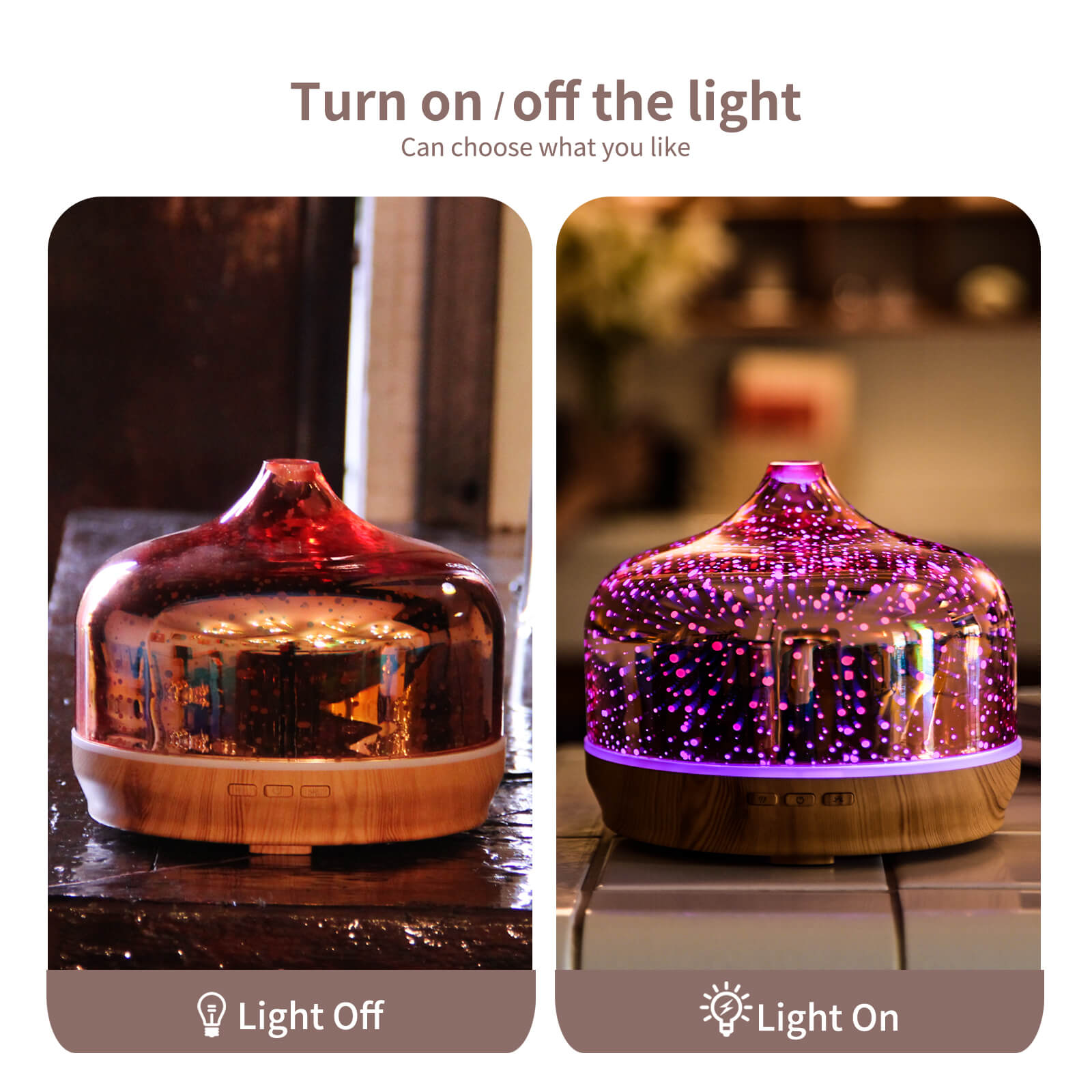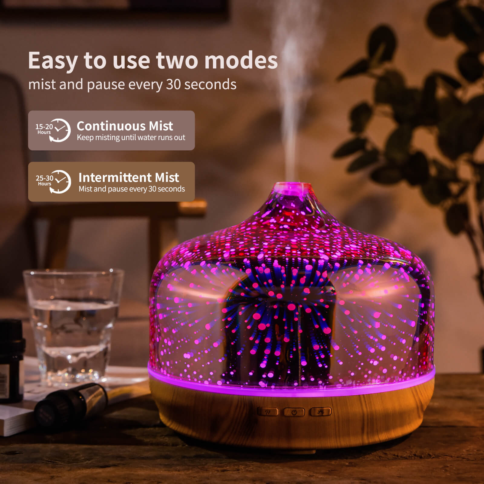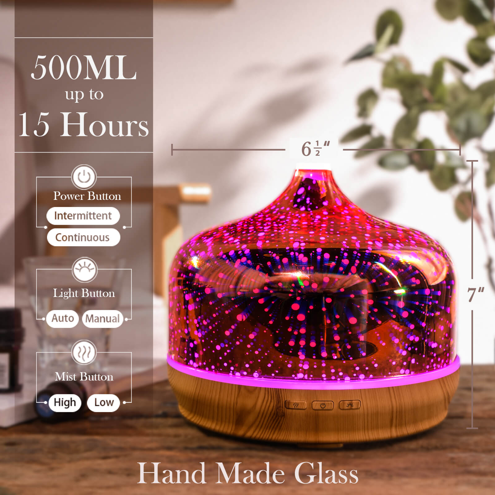 - 【Unique Art Decorative Design】 Our 500ml glass essential oil diffuser has an firework 3D effect glass cover and wood grain decorative base. It is very suitable for your bedroom, living room, children's room, study room, office and yoga room.