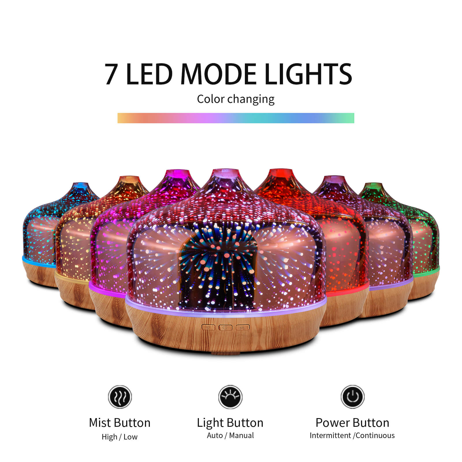- 【Amazing and Charming Light】 The LED lights can be set to 7 different soothing and mesmerizing colors. Press the “LIGHT” button to adjust the light color you prefer (fix/change color). In addition, you can use the mist and light modes individually or together.
