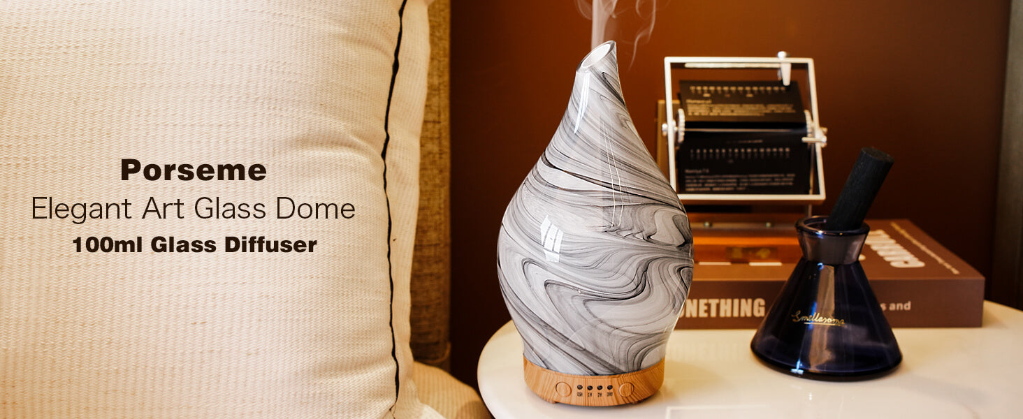 • HANDMADE GLASS DIFFUSER - Our Porseme 100ml aroma diffusers are 5'' in diameter and 9'' in height. They are handblown glass so each glass globe is unique. 100ml essential oil diffuser lasts for 4 hours and has a good output of mist. Fits a room not larger than 15*15(ft). You can place in any area and relax.