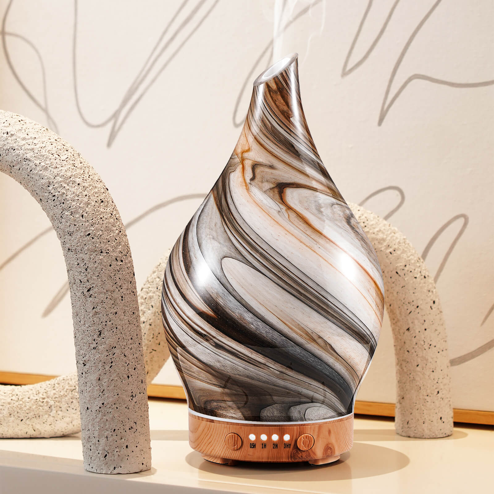 • UNIQUE ART DECORATIVE DESIGN - Our 100ml glass essential oil diffuser has an elegant starry pattern glass cover and wood grain decorative base. It is very suitable for your bedroom, living room, children's room, study room, office, and yoga room.